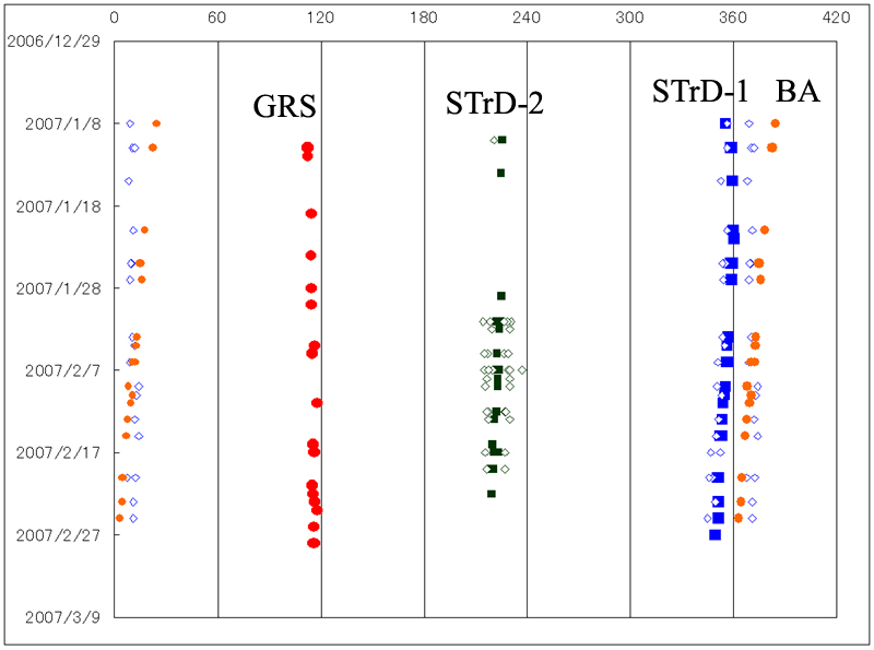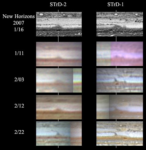 合の間に発生していた南熱帯撹乱(South Tropical Disturbance)の詳しい様子が分かってきました。同時に2つの南熱帯撹乱が発生し、最も目立つ模様として観測されています(画像2)。第1撹乱(STrD-1)はII=350度に位置し、1月初めには長さが15度ほどの暗部でしたが、2月に入ると後端部が小さくなり、前端部の暗柱だけが目立っています。しかしながら、撹乱の全体の長さは20度ほどに広がっています。ドリフトチャート(画像4)から、撹乱部は当初体系IIに対して静止していましたが、後方からSTB白斑"BA"が接近したことによって、撹乱の前端部だけがBAと同じ速度で前進を始めました。なお、撹乱の後端部は相変わらず静止していますので、今後は少しずつ撹乱部が広がるのではないかと予想されます。第2撹乱(STrD-2)はII=220度に位置し、長さが10‐15度ほどの太い暗柱で、ほとんど静止しています。
