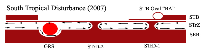南熱帯撹乱は、暗柱または暗部が発生し、SEBsを後退する暗斑が撹乱に出会うと、今度は逆にSTB北縁を前進するという「循環気流」が形成されることが決め手になります。過去の事例では、循環気流が形成されるのはもっと後のことだと考えられていました。しかしながら、今回は同時に2個の撹乱が発生したことと、冥王星探査機ニュー・ホライズンズによって作成された動画などの解析から、撹乱発生直後にはすぐに循環気流が形成されていたのではないかと思われます。画像3に、今回の南熱帯撹乱のモデル図を示します。循環気流はSTrD-2からSTrD-1までの領域と、STrD-1から大赤斑を超えてSTrD-2の領域と、2つに分割されているのではないかと考えています。