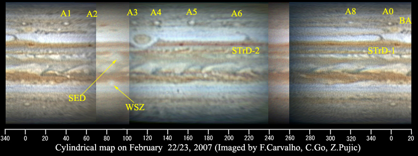 2006年5月頃からEZs全体が黄色く濁ってきて、今シーズンの初めはSEBとEZsがいっしょになった太いベルトに見えていました。ところが、2月にはEZsの大白斑の活動が活発になり、特に2月20日頃に大赤斑の北を追い越した際に、SEBnからEZsに白雲が流れ込む様子が観測されています。さらにこの大白斑の直後には大きな暗部が一体として活動しており、これを南赤道撹乱(SED)と呼んでいます。このSEDの前方には小さな白斑とフェストーンが広がり、明るいEZsが部分的に復活してきています。