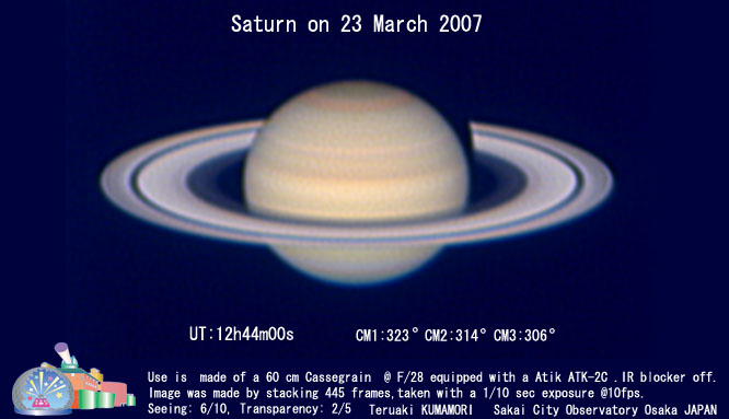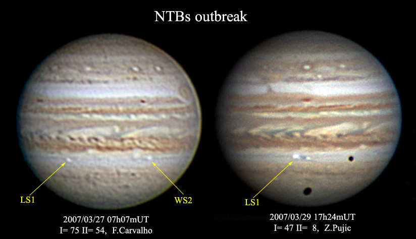 2007年3月27日、ブラジルのFabio Carvalho氏からNTB(北温帯縞)南縁のI=47.5度(LS1)とI=103.4度(WS2)に輝く白斑をとらえた画像の報告がありました(画像1)。続いて、3月29日にオーストラリアのZ.Pujic氏から白斑LS1がI=38.0度に前進し、さらにI=47.2度にも新たな白斑が発生し、その間に暗斑が発生した画像の報告がありました。