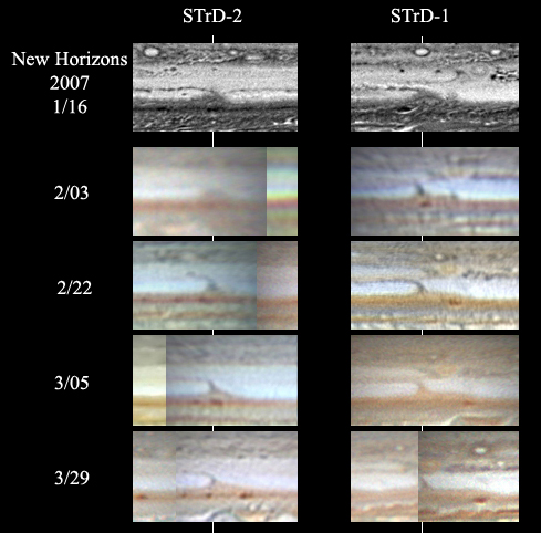 両方の撹乱とも、SEB(南赤道縞)の南縁が台形状に盛り上がっていて、その前端部から暗柱がSTB(南温帯縞)北縁まで伸びています。南熱帯撹乱を特徴づける循環気流はすでに形成されています。