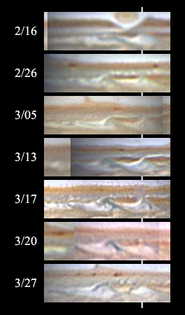 近年の南赤道帯撹乱SEDの活動は、2000年に活発な様子が観測されましたが、その後は2004年と2006年に弱い活動が観測されています。2000年の観測では、SEDが大赤斑を追い越した際に活動が活発になりましたが、しばらくすると活動が弱まる、を繰り返しました。今シーズンのSEDの活動はこれまでと異なり、全周にわたって活発な白斑の活動が見られます。また、SEBnからEZsに白雲が流れ込む(吹き出す)様子が観測されています。2月下旬からSEDのメインである大白斑のさらに前方に、新たな白斑が形成されました。この2つの白斑とその間の2つの暗部が、新たなSED複合体を形成しています(画像3)。