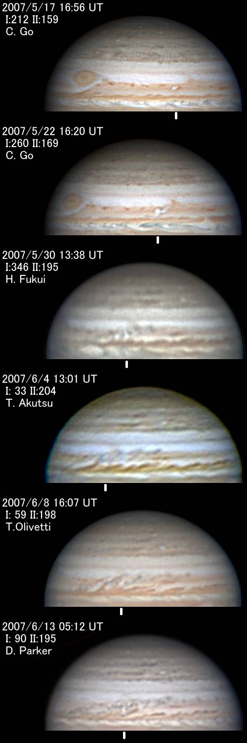 [図1] SEB攪乱の発達 撮像:C.Go(フィリピン、28cmSCT)、福井英人氏(静岡県、35cm反射)、阿久津富夫氏(フィリピン、28cmSCT)、T.Olivetti(タイ、28cm反射)、D.Parker(米国、40cm反射) (拡大) |