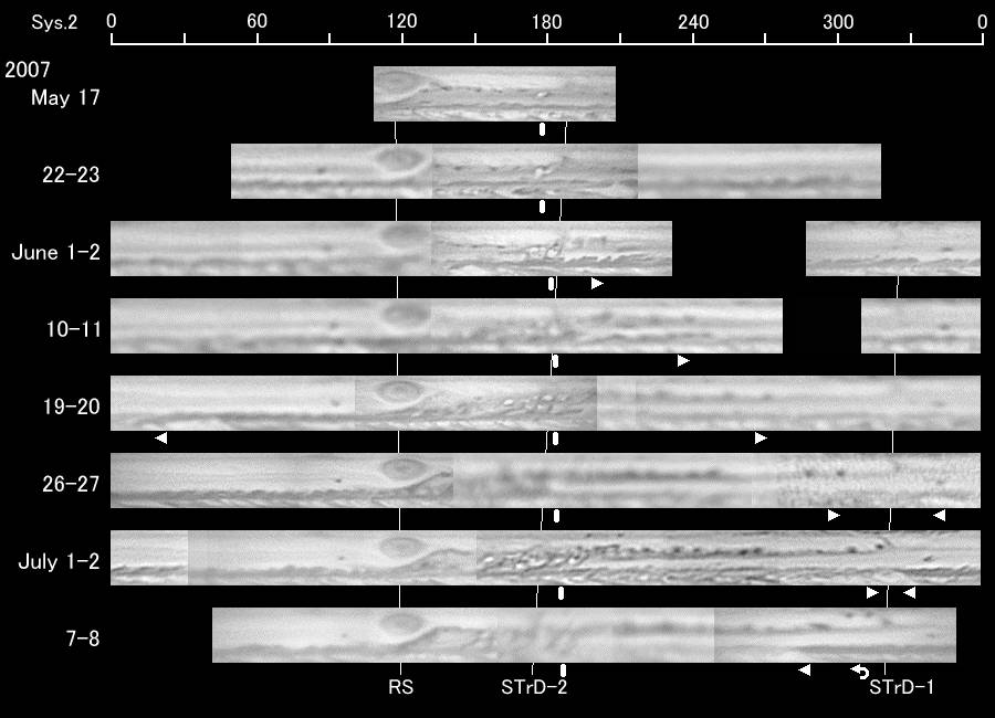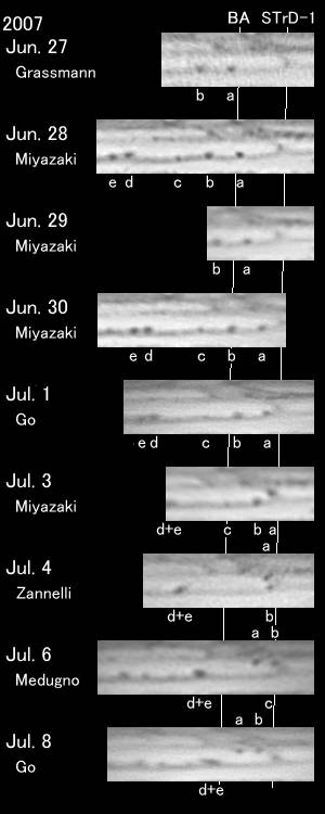 SEBsを後退していた先頭の暗斑がSTrD-1に到達したのは7月2日のことです。翌3日にはSTrD-1の暗柱に沿って南側へ移動し始め、4日にSTBnに達しました。そして、6日にはSTBnのジェットストリームに乗って前進を始めたことが確認されたのです。SEBsの後退暗斑が循環気流によってUターンする様子が直接観測されたのは1930年代に1度あるだけで、実に73年ぶり2回目のこととなります。今回の現象の一部始終を詳細に捉えることができたのは、世界的に見ても沖縄の宮崎勲氏ただひとりです。2日後の7月4日には2つ目の暗斑がSTrD-1に達して、同じようにSTBnへと移動し、前進運動に変化しています。その後方にも明瞭な暗斑が多数控えており、今後続々とUターン運動が観測されることが期待されます。