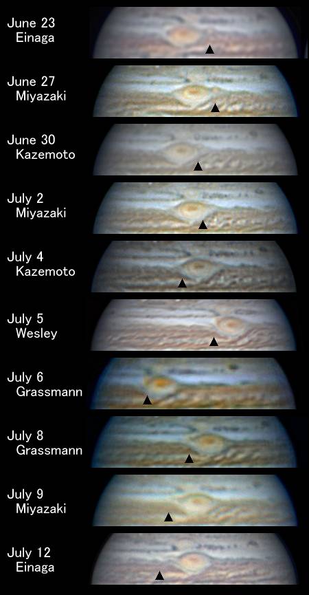 [図1] 大赤斑とBAとLRSの会合 撮像:永長英夫氏(兵庫県、30cm)、宮崎勲氏(沖縄県、40cm)、風本明氏(沖縄県、50cm)、Anthony Wesley氏(オーストラリア、33cm)、Guilherme Grassmann氏(ブラジル、25cm) |
