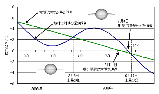 [図4] 土星の環の傾きの変化 地球に対する環の傾きは、2008年末に一旦、最小となる。 |