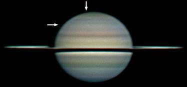 [図2] 土星の白斑 2008年12月10日 20:53UT I=156.3° III=326.5° 撮像:阿久津富夫氏(フィリピン、35cm) |