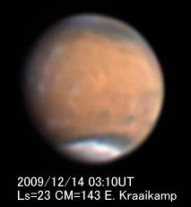 [図2] 火星の山岳雲 左に3つ並んだ雲はタルシス3山、中央に近いものはオリンピア山、一番 下の雲はアルバ火山。いずれも顕著に見られる。 撮像:エミル・クラーイカンプ氏(オランダ、25cm) |