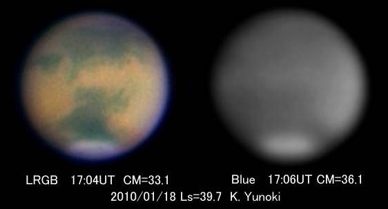 [図1] 北極冠エッジダストストーム 左)撮像:エフライン・モラレス・リベラ氏(プエルトリコ、30cm) 右)撮像:ピック・ドゥ・ミディ天文台 |