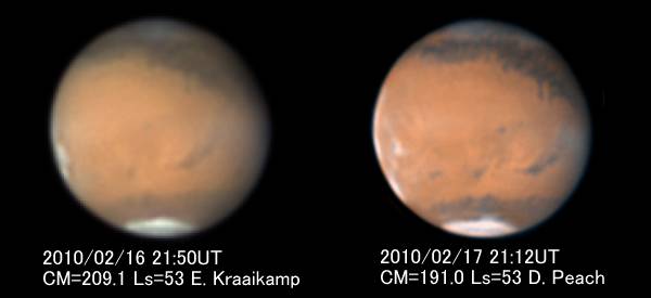 [図1] 北極冠エッジダストストーム 左) 北極冠から中央に向かって伸びる白い突起がダストストーム。 撮像:エミル・クラーイカンプ氏(オランダ、25cm) 右) 翌日の画像、幅は広くなり、位置も東にずれている。 撮像:ダミアン・ピーチ氏(イギリス、35cm) |
