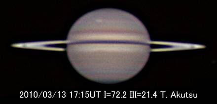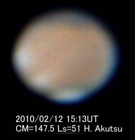 [図3] 火星の山岳雲 3つ並んだ中央の雲がアルバの雲。 撮像:阿久津弘明氏(北海道、28cm) |