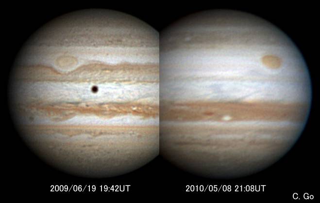 [図1] この1年間における木星面の変化 SEBが淡化しNEBが幅広くなった、大赤斑の濃度と赤みの変化にも注目。 2画像をベルトの位置や太さがわかりやすいように合成した。 撮像:クリストファー・ゴー氏 (フィリピン、28cm) |