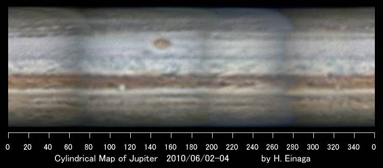 [図2] 6月2日〜4日における木星面展開図 永長英夫氏(兵庫県、30cm)が撮像・作成したものを筆者改編。 |