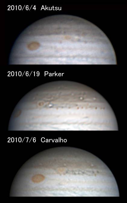 [図1] BAと小白斑の合体 上) 合体前:BA後方に白斑が見える。撮像:阿久津富夫氏(フィリピン、35cm) 中央) 合体直後:赤いBAが白いリングで囲まれている。後方には白斑が出現。撮像:ドナルド・パーカー氏(米国、35cm) 下) 合体後:BA後方にSTB remnantが濃化している。撮像:ファビオ・カルバロ氏(ブラジル、35cm) |