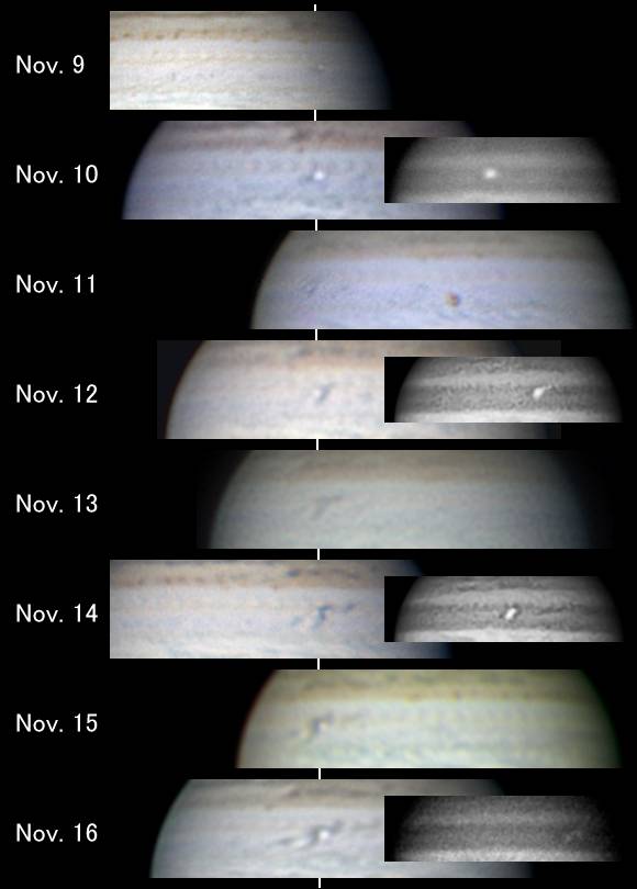 [図1] SEB攪乱の発達 小白斑の発生から一週間で、暗色模様が東西に広がり始めている。 右はメタンバンドによる画像。 撮像:クリストファー・ゴー氏(フィリピン、28cm)、熊森照明氏(大阪府、28cm)、 阿久津富夫氏(フィリピン、35cm)、サデグ・ゴミダデ氏(イラン、24cm)、 永長英夫氏(兵庫県、30cm)、ドナルド・パーカー氏(米国、40cm)、 ジャウム・カステラ氏(スペイン、36cm)、 クリスチャン・ファッティンナンジ氏(イタリア、36cm)、 デビッド・アルディッティ氏(イギリス、36cm) |