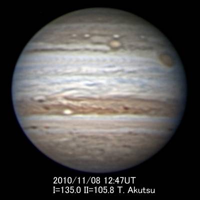 [図2] 11月の木星面 BAの前方で2つのAWOが接近している。NEBの白斑はWSZ。右端に大赤斑が見える。 撮像:阿久津富夫氏(フィリピン、35cm) |