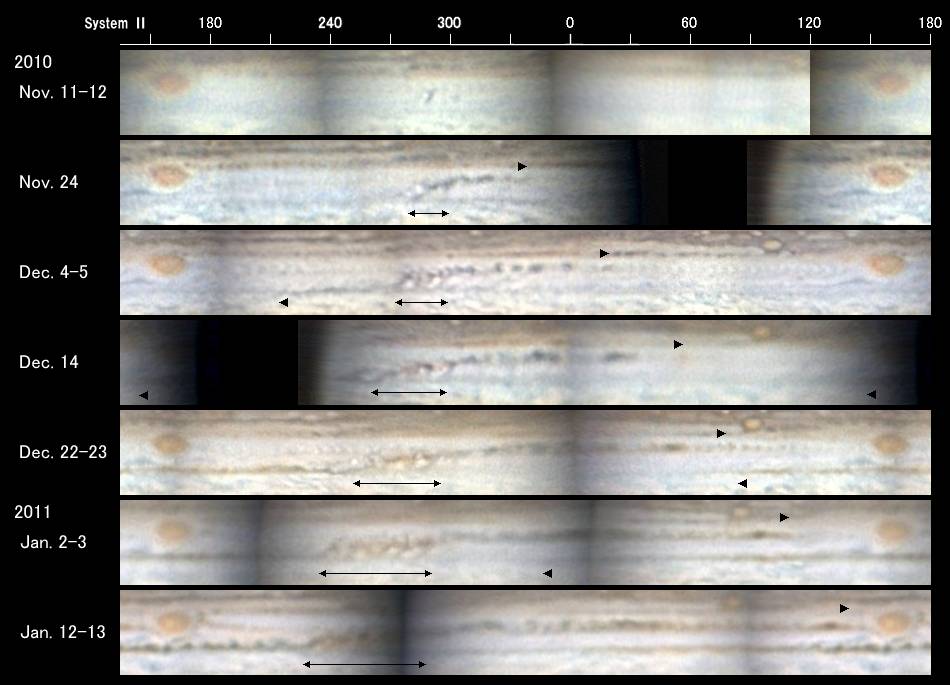 SEB北組織(SEBn)を経度減少方向に広がる北分枝は、1月10日までに木星面を一周