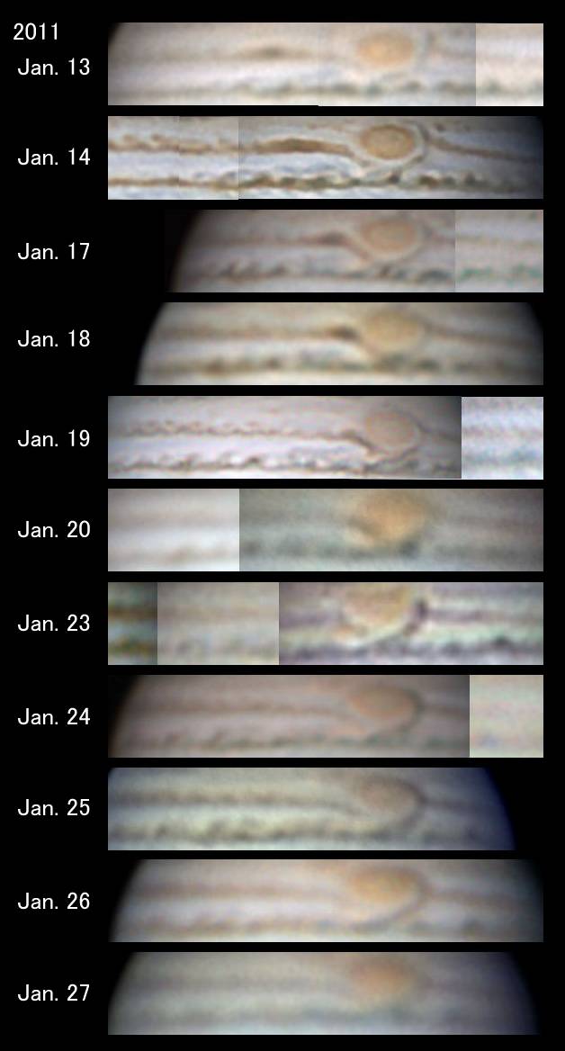 [図1] SEB攪乱南分枝と大赤斑の会合 月惑星研究会の観測から伊賀祐一氏が作成した組画像を筆者が抜粋・編集 |