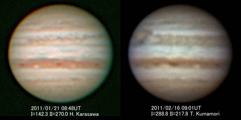 [図2] 攪乱活動によって復活したSEB 中央分枝の活動によって、濃く幅広いSEBが復活している。先端は大赤斑のすぐ後方に迫っている。 撮像:(左)唐澤英行氏(東京都、30cm)、(右)熊森照明氏(大阪府、28cm) |