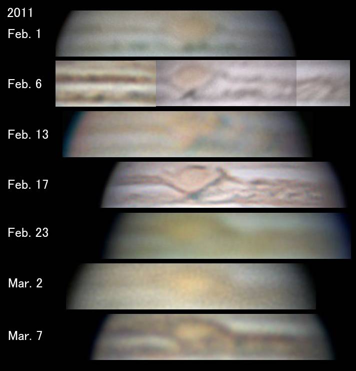 [図1] 2月以降の大赤斑周辺の変化 大赤斑が赤斑孔に変化し、中央分枝が後方のSEBを埋めて行く様子に注目。 月惑星研究会の観測から伊賀祐一氏が作成した組画像を筆者が抜粋・編集 |