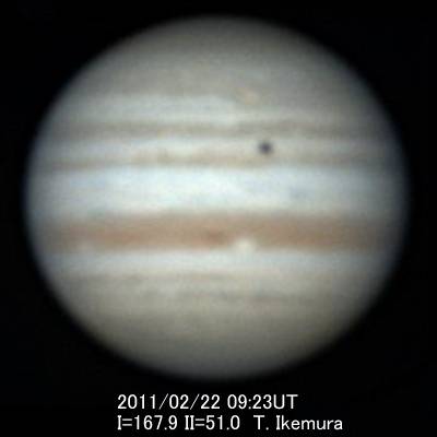 [図2] 小さくなった永続白斑BA 矢印部分にBAがある。NEB北縁の白斑(WSZ)よりも小さい。SEB上の黒点はイオ。 撮像:池村俊彦氏(愛知県、38cm) |