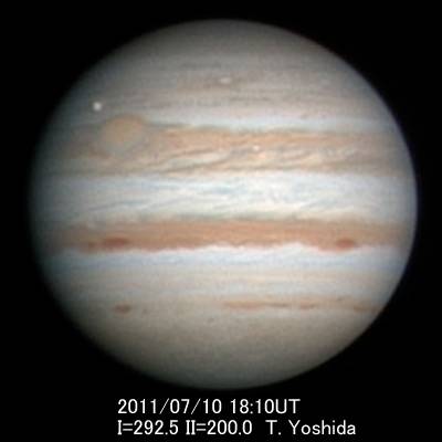 [図1] 赤斑孔とその後方の木星面 赤斑孔後方のSEBに乱れた領域が見られる。赤斑孔左上の白点はエウロパ。 撮像:吉田知之氏(30cm、栃木県) |