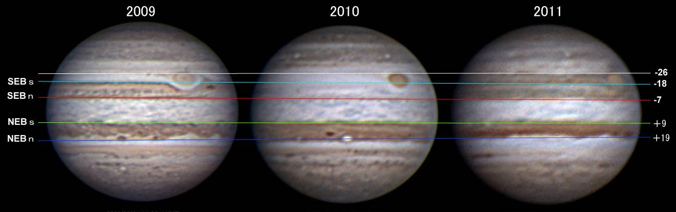 [図3] 最近3年間の主要なベルトの緯度変化 SEBとNEBの南縁北縁の緯度を比較してある。2010年のNEBと今年のSEBの太さに注目。阿久津富夫氏撮像・作成作成(フィリピン、35cm)、筆者改編(拡大) |