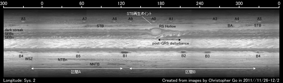 [図1] 11月末〜12月初の木星面展開図 クリストファー・ゴー氏(Cristopher Go、フィリピン)の画像から筆者作成。SEBが全周で顕著なのに対して、北半球は、区間Aではまだ縞模様が見られるものの、区間Bでは模様に乏しくなっているのがわかる。 |
