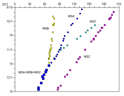 面白いことに合体白斑WSA+WSB+WSCは、WSAの前進速度を継承しており、1日当た