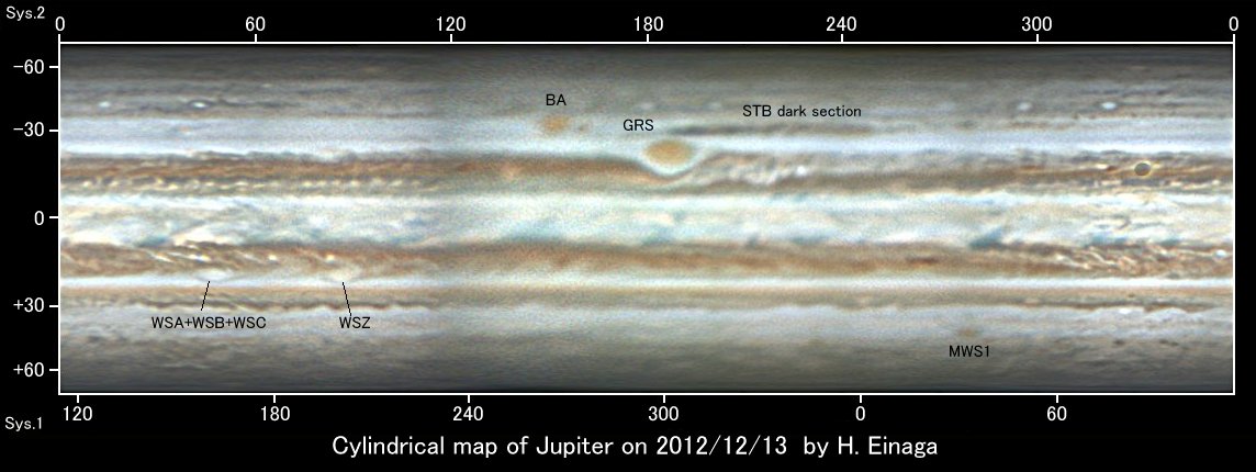 | SEB南縁に細かい凹凸が増えた。NEBはII=50〜200°で北縁が淡化を始めている。撮像・作成:永長英夫氏(兵庫県、30cm)、筆者改編 |