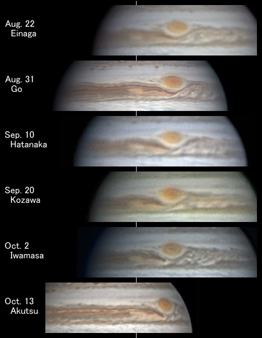 | 明部から流出した赤みを帯びた雲が大赤斑前方のSEBに広がる様子がわかる。撮像:永長英夫氏(兵庫県、30cm)、クリストファー・ゴー氏(フィリピン、35cm)、畑中明利氏(三重県、40cm)、小澤徳仁郎氏(東京都、32cm)、阿久津富夫氏(フィリピン、35cm) |