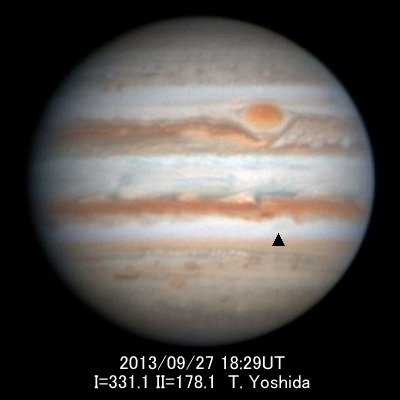 | 大赤斑の真北にWSZ(矢印)が見られる。前方のNEはかなり細くなっている。撮像:吉田智之氏(栃木県、30cm) |