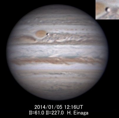 | 大赤斑の後端にエウロパが差し掛かっている。エウロパが自分の影の一部を覆い隠している(右上の拡大図)。撮像:永長英夫氏(兵庫県、30cm) |