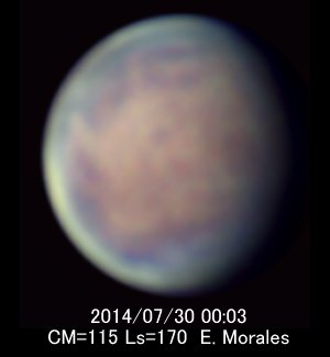 | アキダリウム上空にダストが広がり、北極冠は見えない。撮像:エフライン・モラレス氏(プエルトリコ、30cm) |