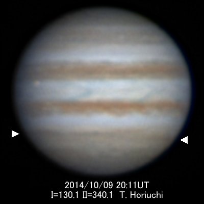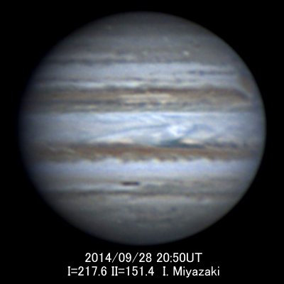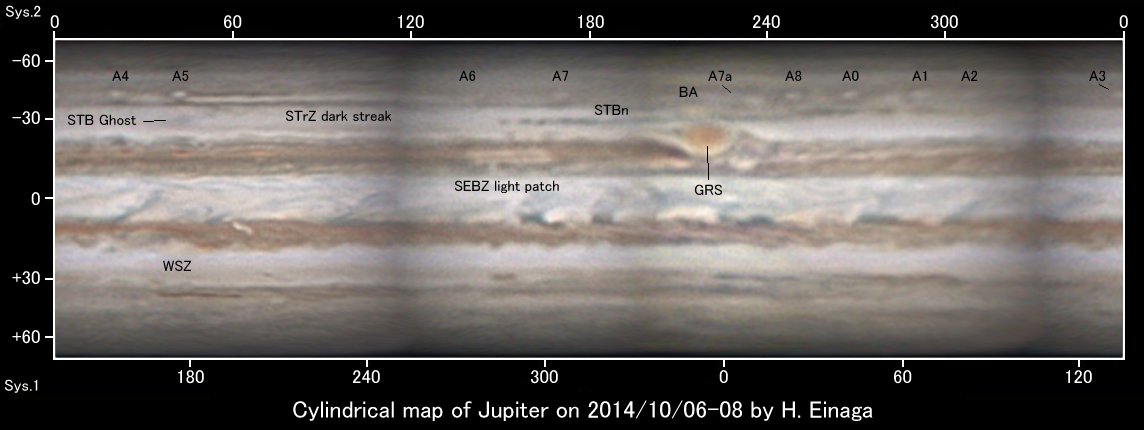 | 10月6日〜8日の観測から作成。大赤斑前方の領域に話題の模様が集中している。撮像・作成:永長英夫氏(兵庫県、30cm) |