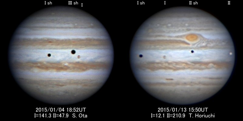 | 今シーズンはDeがゼロに近いため、衛星が頻繁にEZを横切ります。左) イオとガニメデの影、そのすぐ右下にイオの本体が経過中。撮像:大田聡氏(沖縄県、30cm)。右) 木星面の左側にイオの本体と影、右側にエウロパの本体と影が経過中。撮像:堀内直氏(京都府、30cm) |