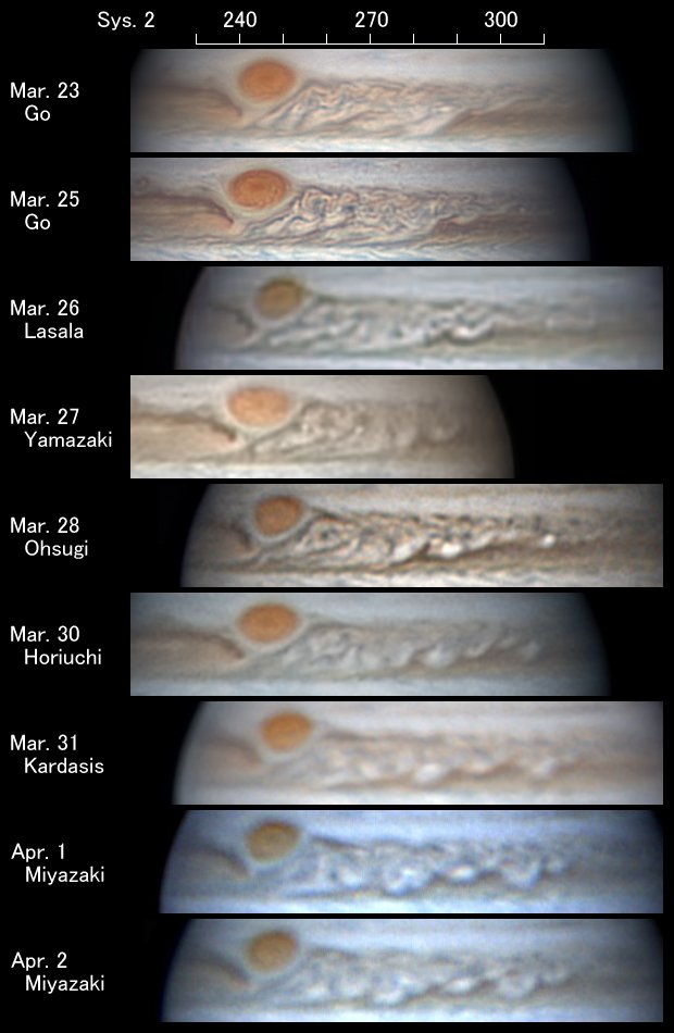 す。3月下旬には大赤斑に到達して、面白い現象が見られるかと期待していましたが、し
