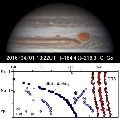南赤道縞(SEB)では、3月に始まった白雲活動によって大赤斑(GRS)後方が大きく乱れてい