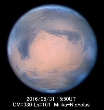 | 火星像の南の縁にできた白いベルトが雪雲の端。撮像:ミリカ−ニコラス氏(オーストラリア、35cm) |