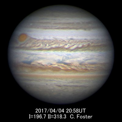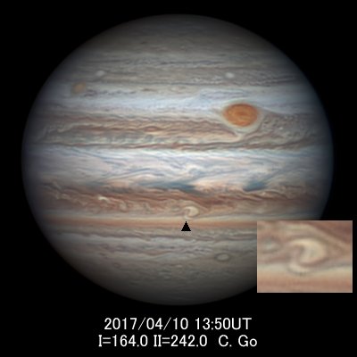 北赤道縞(NEB)でも激しいリフト(rift)活動が続いており、衰える気配が見られません。 主要な活動領域はII=340〜120°と木星面の3分の1を超えています。 動画で見ると、NEBの北部はリフトの白雲で大きなうねりを生じていて、ベルトを再拡幅させる引き金になったように思われます。 拡幅したベルト北縁には小白斑がいくつも見られるようになっています。 このうちII=250°にある大きな白斑に、後方から小さな白斑が接近、4月8日以降、両者の合体が進行中です。 また、II=170°にも高速で前進する白斑があるので、近い将来、約60°前方にあるWSZとの合体が見られるかもしれません。