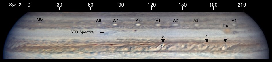 最近、上記のA5aの前後では、SSTB南部に小さな白斑がずらりと並んでいるのが目につきます。 この経度のSSTBはとても幅広く二条になっていて、白斑は南組織の中に埋もれています。 AWOほどの明るさはなく、形がはっきりしないものも見られます。 これらはII=100°台で形成されているようで、南緯43°を流れる前進ジェットストリーム(S3 jet)に乗って1日当たり-3°という高速で前進しています。 この緯度での白斑群はほとんど例がありません。 木星探査機Junoの画像で見ると、白斑は右回りの低気圧的な循環を持っているようですが、詳しい振舞いはよくわかっていません。