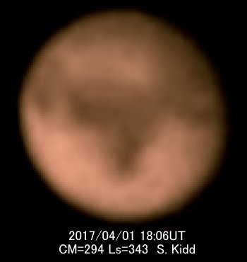 火星観測は事実上、今月で終わりになると思われます。 視直径は4.5秒くらいと非常に小さくなりましたが、熱心な観測者によってまだ継続されています。 気になる南極冠ですが、3月15日のマーチン・ルイス氏(Martin R Lewis)の観測では明瞭に見られました。 4月1日にはサイモン・キッド氏(Simon Kidd)が南極のエッジにかろうじてとらえています。 今シーズンはこれが南極冠の最後の記録となるでしょう。 Ls=343°となり、北半球は春分に近づいてきました。