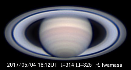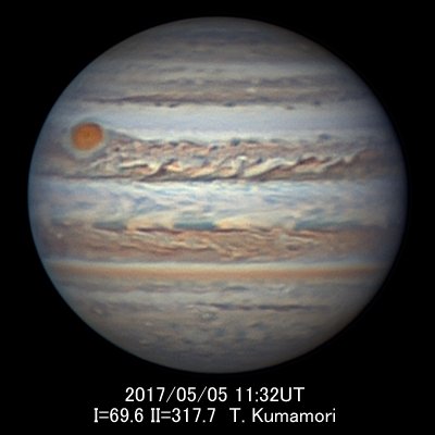 大赤斑は相変わらず赤みが強く顕著ですが、周囲に再び小規模な暗部が出現しています。 後方のSEBが盛り上がってブリッジが形成され、前方には短いストリーク(dark streak)が見られます。 前方のSEB南縁が乱れているので、mid-SEB outbreakの影響と思われます。 経度はII=270°で、4月半ば以降、後退が止まりました。 長径は約14°で、昨シーズンと変化ありません。