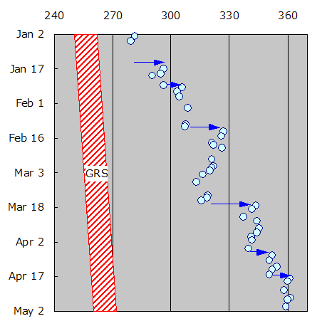 大赤斑後方に広がる白雲の活動域であるpost-GRS disturbanceも活発で、衰える気配はまったく見られません。 見た目の活動はmid-SEB outbreakとよく似ていますが、こちらは白雲の湧出場所が後方にジャンプすることで活動域が広がっていくという特徴があります。 今回は1月下旬に活動が始まって以来、半月〜ひと月に一度の割合でジャンプを繰り返しており、4月中旬にはついにII=0°に白斑が出現し、活動域の長さは90°になりました。 普段は最大でも60〜70°程度なので、これほど発達するのは異例なことです。