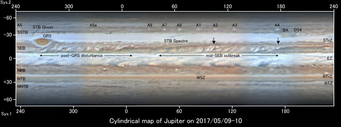 木星南赤道縞(SEB)はmid-SEB outbreakとpost-GRS disturbanceの2つの攪乱活動が同時に起きていて、どの経度を見ても乱れた白雲が広がっています。