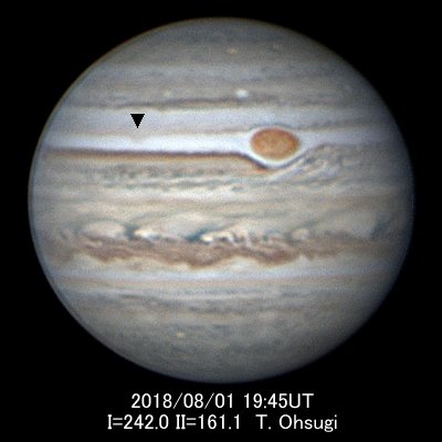 南熱帯攪乱(S. Tropical Disturbance)の名残の「くびれ」模様から形成された大赤斑(GRS)前方の南熱帯(STrZ)を横切る暗柱は、7月上旬で消失してしまい、期待に反して攪乱は再生しませんでした。 暗柱形成の原因となった南赤道縞(SEB)南縁の後退暗斑群が途絶えたためと思われます。 南熱帯紐(STrB)には「くびれ」がまだ残っています。 英国天文協会(BAA)のロジャース(J.H. Rogers)氏は、このくびれに「南熱帯攪乱後端の息子(Son of f-STropD)」という味のあるニックネームをつけています。 現在、SEB南縁には多数の大きな暗斑で乱れている領域がありますので、息子がこれらと会合して攪乱に成長するか、今後も見守ることにしましょう。