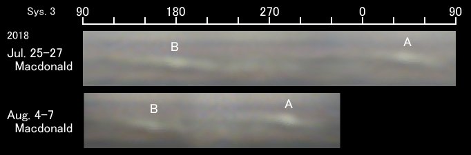 | 白斑A、Bとも傾いた明帯になっている。Aの方が高速で前進しているのがわかる。8月中には再びBと会合するだろう。 |