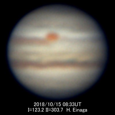 木星南熱帯攪乱(S. Tropical Disturbance)で明け暮れた2018シーズンも終わりを迎えました。 条件が悪く細部はつかめなくなりましたが、鮮やかなオレンジ色の大赤斑(GRS)がとても目立ちます。 大赤斑の後方では南赤道縞(SEB)の北部が淡化して、ベルトの幅が半分になっています。 白雲の湧出活動(post-GRS disturbance)であれば、南部が淡化し北部は濃く残るので、異なる現象と思われます。 SEB北部の淡化は、木星面を半分近く回ったII=100°付近まで及んでいるようです。