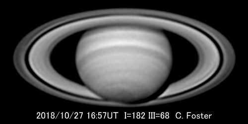 土星土星のPolar Stormの活動が続いています。 2つの明部はどちらも東西に拡散し、不規則な形状に見えることが多くなりました。 そのため、正確な位置の測定は困難になっています。 明部Aと明部Bは10月下旬に5度目の会合をしたはずですが、詳しい状況はつかめていません。 27日のフォスター氏(C. Foster、南アフリカ)の画像では、III=0〜80°に長く伸びた明帯が見られます。 おそらく、前端部分がA、後端部分がBに相当すると思われます。