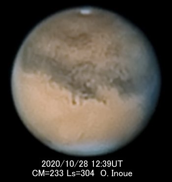 | 南極冠は縮小してかなり小さい。衝を過ぎてターミネーターが反対側に移動し、今後は右側(西)から欠けて行く。撮像:井上修氏(大阪府、28p) |